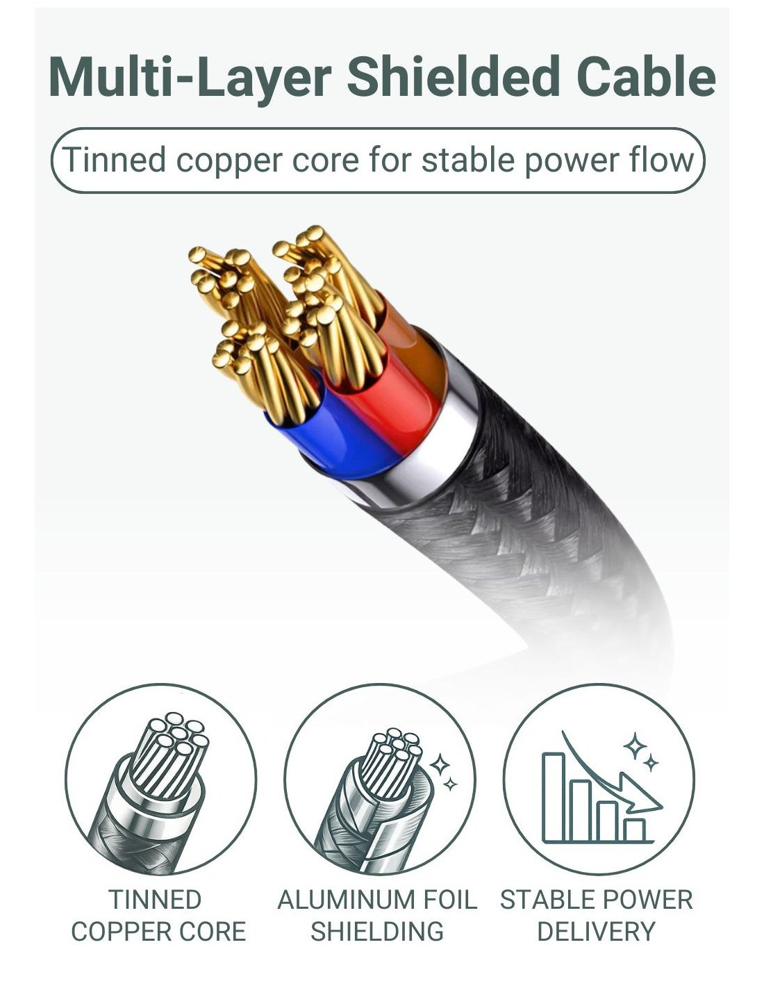 Built with a multi-layer shielded structure and a tinned copper core, the cable ensures stable power flow, reduced interference, and reliable charging performance.