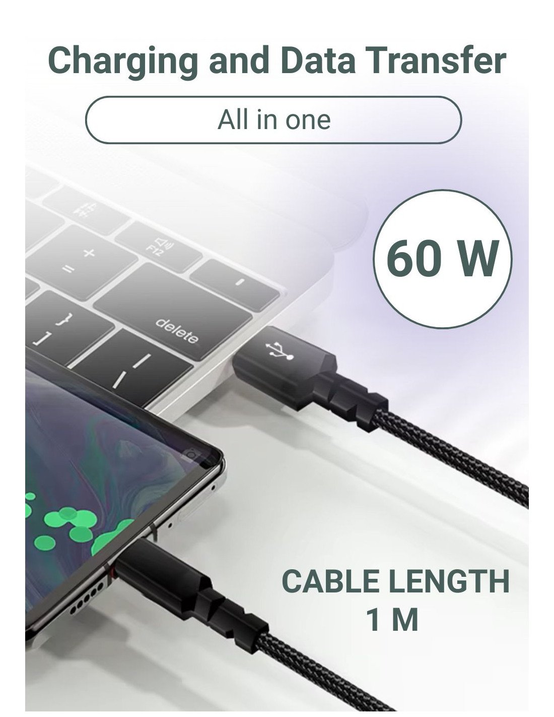 Supports fast charging up to 60 W with 3 A current, making it suitable not only for smartphones but also for power-hungry devices such as laptops. The cable also enables reliable data transfer using a single connection.