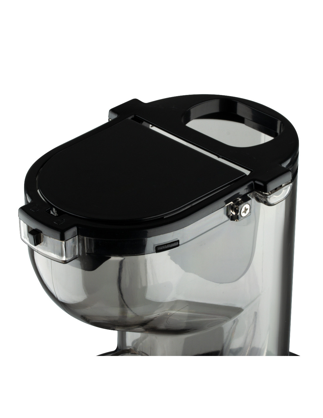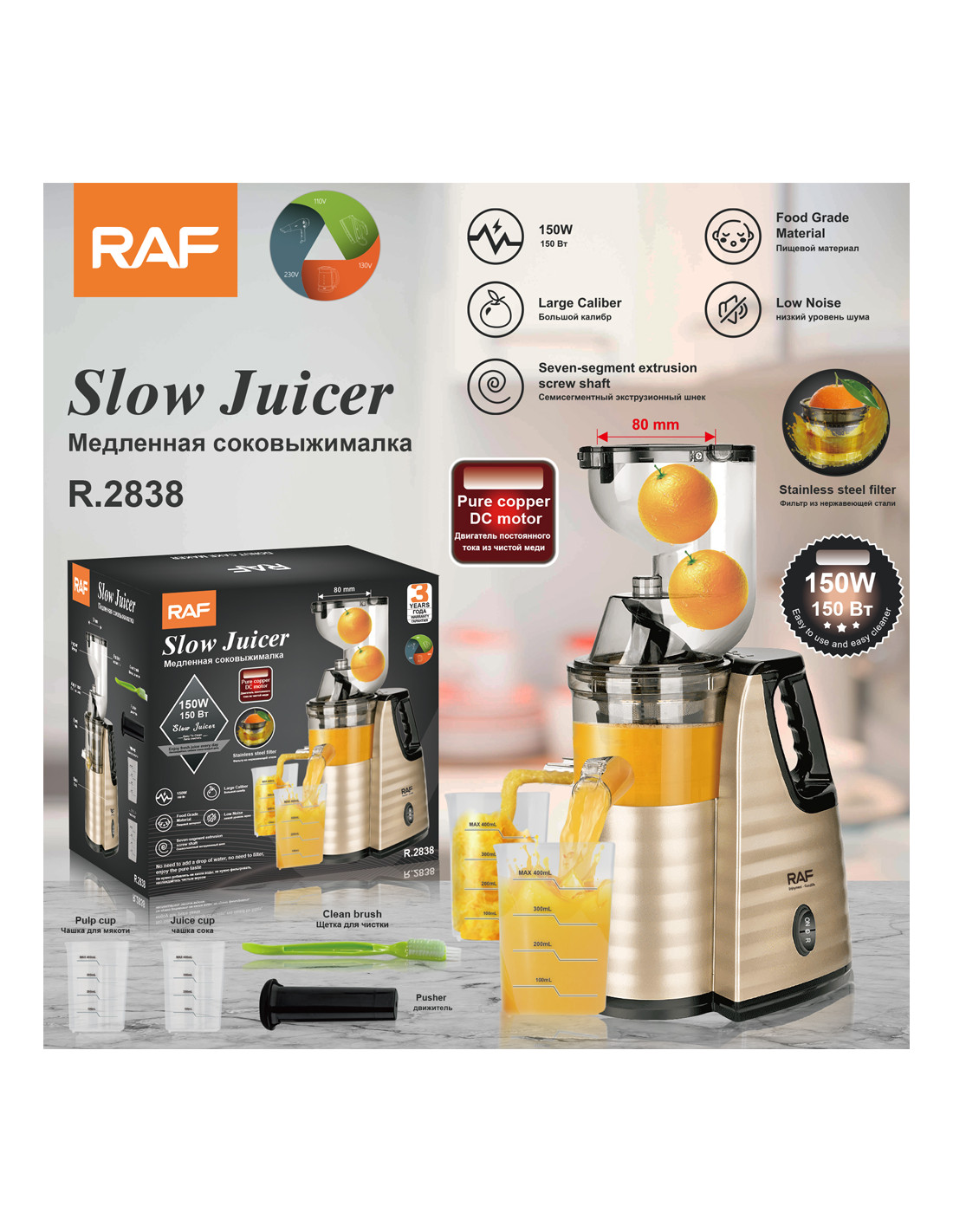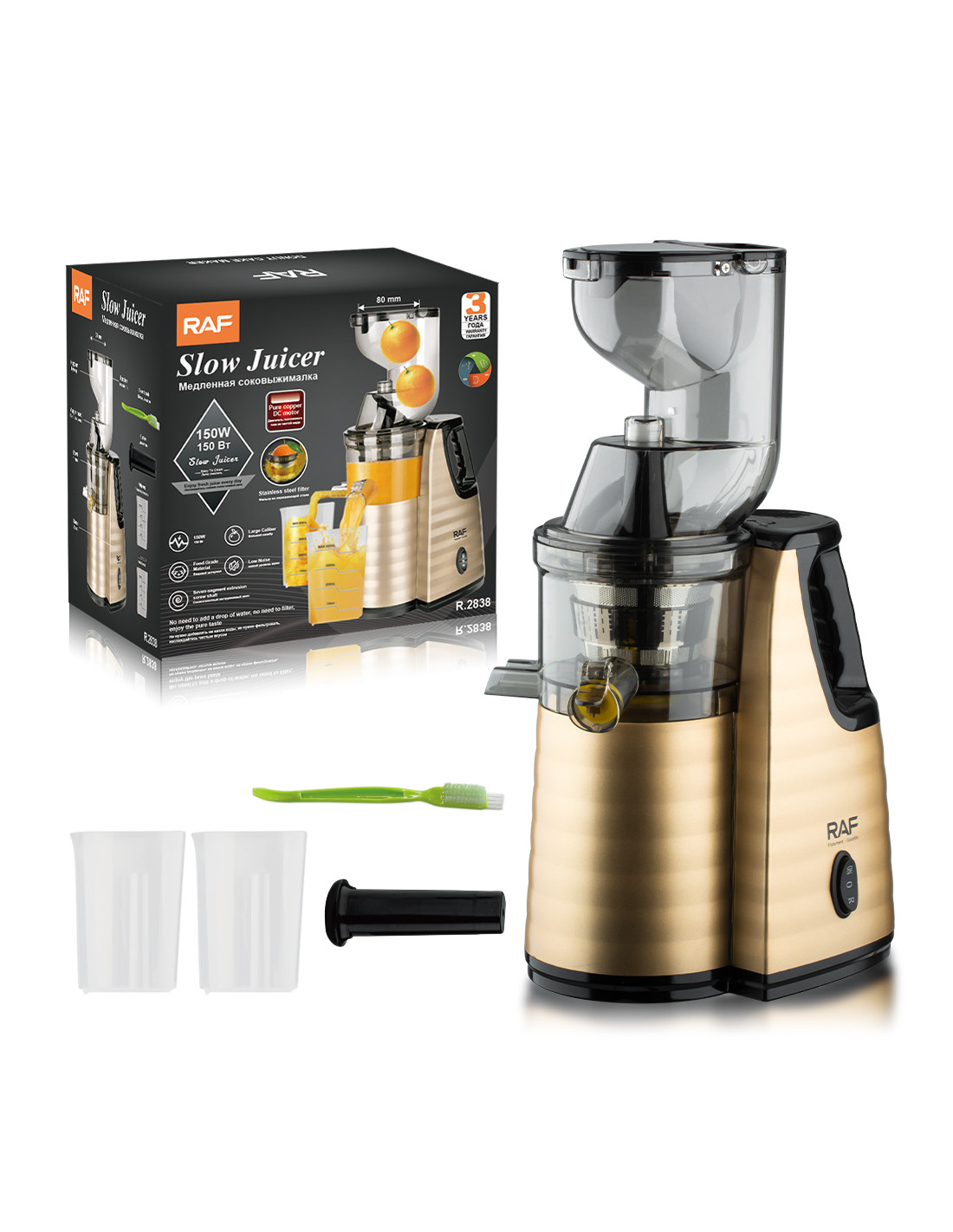 Cold-press juicer with a 150 W DC motor, 80 mm wide chute, reverse anti-jam, and BPA-free Tritan bowl. Includes juice & pulp cups, pusher, and cleaning brush for quick, low-foam, nutrient-rich juice.
