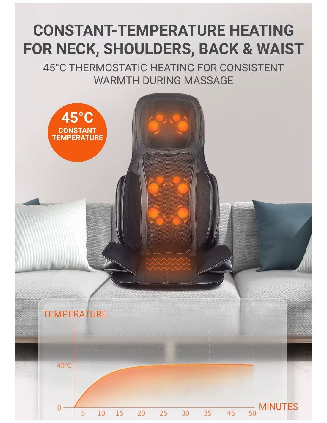 • Adjustable massage height: neck massage heads adjust approximately 9,5 cm to fit users of different heights.