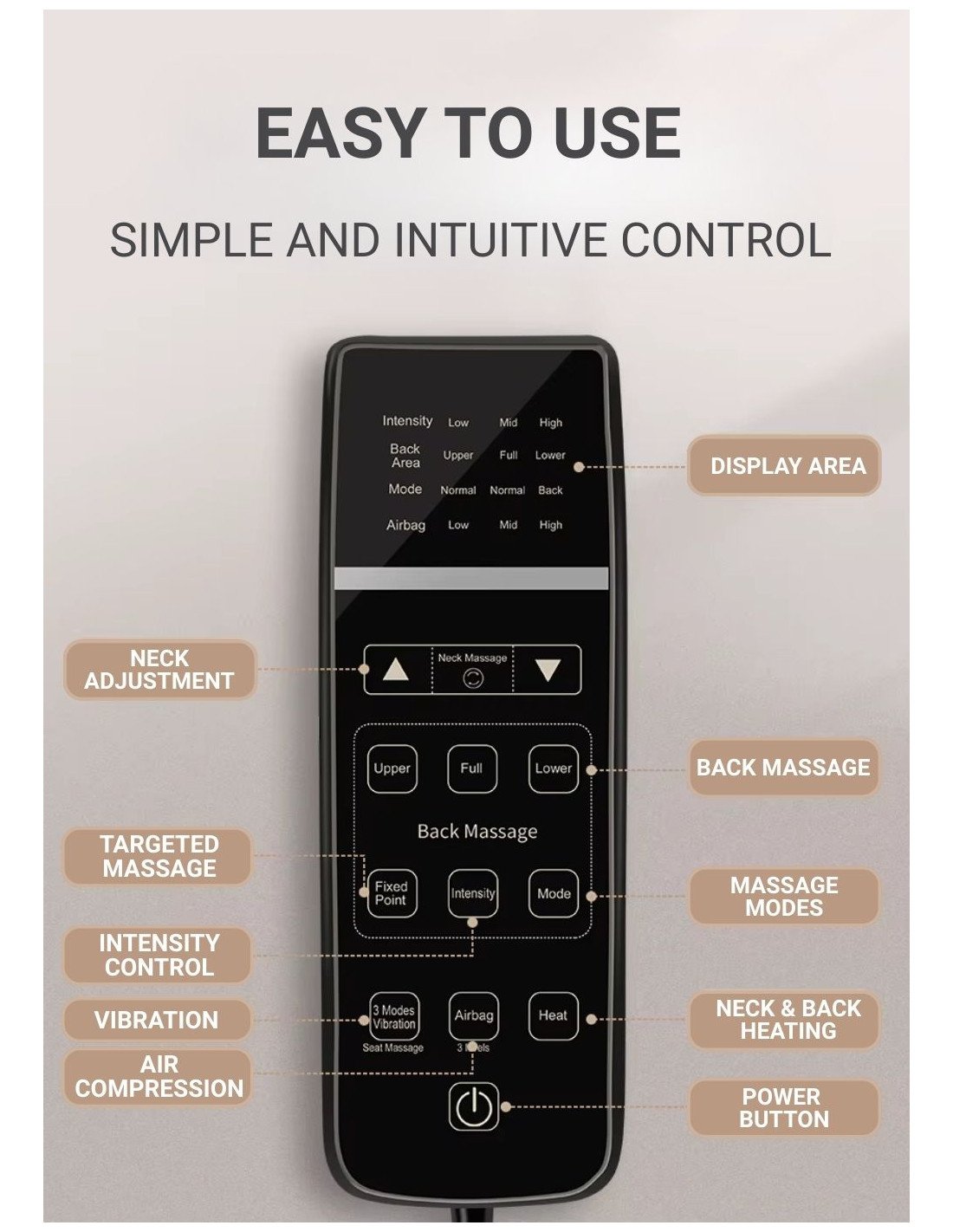 • Easy control: intuitive control panel with up and down buttons for precise neck and shoulder height adjustment.