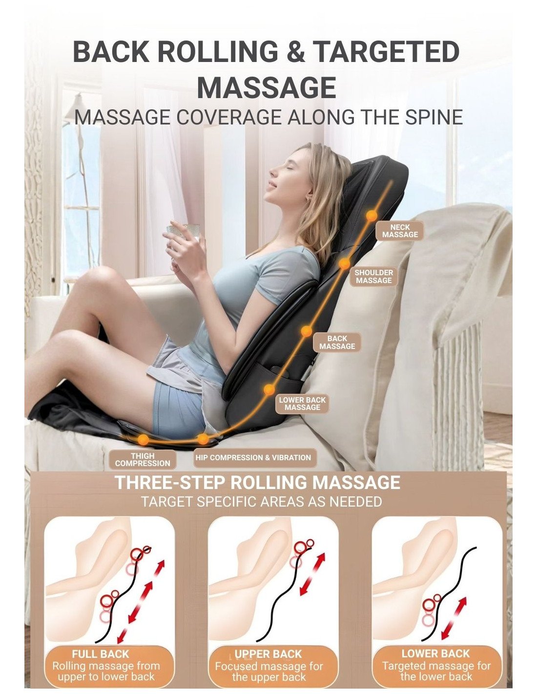 • Kneading massage function: imitates hand massage to reduce muscle stiffness and fatigue.