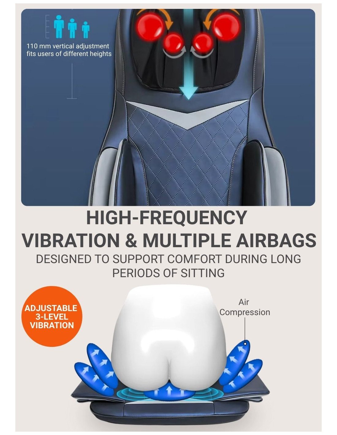 • Heating function: gentle warmth helps relax muscles and enhances massage effectiveness.