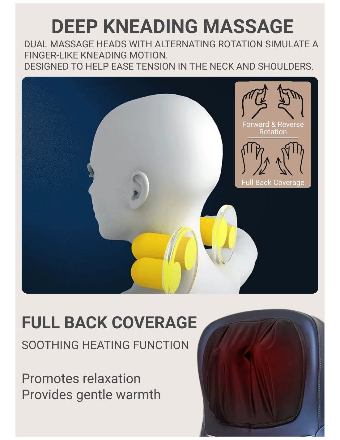 • Vertically moving massage heads: massage heads move up and down to cover the neck, shoulders, and full back area.