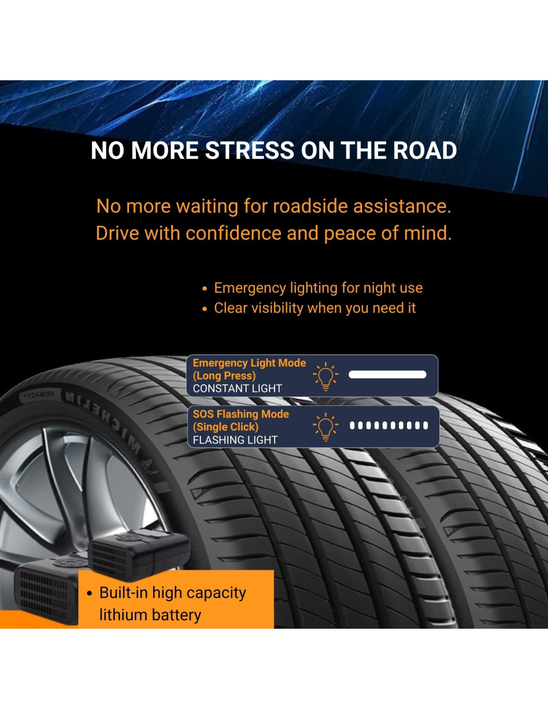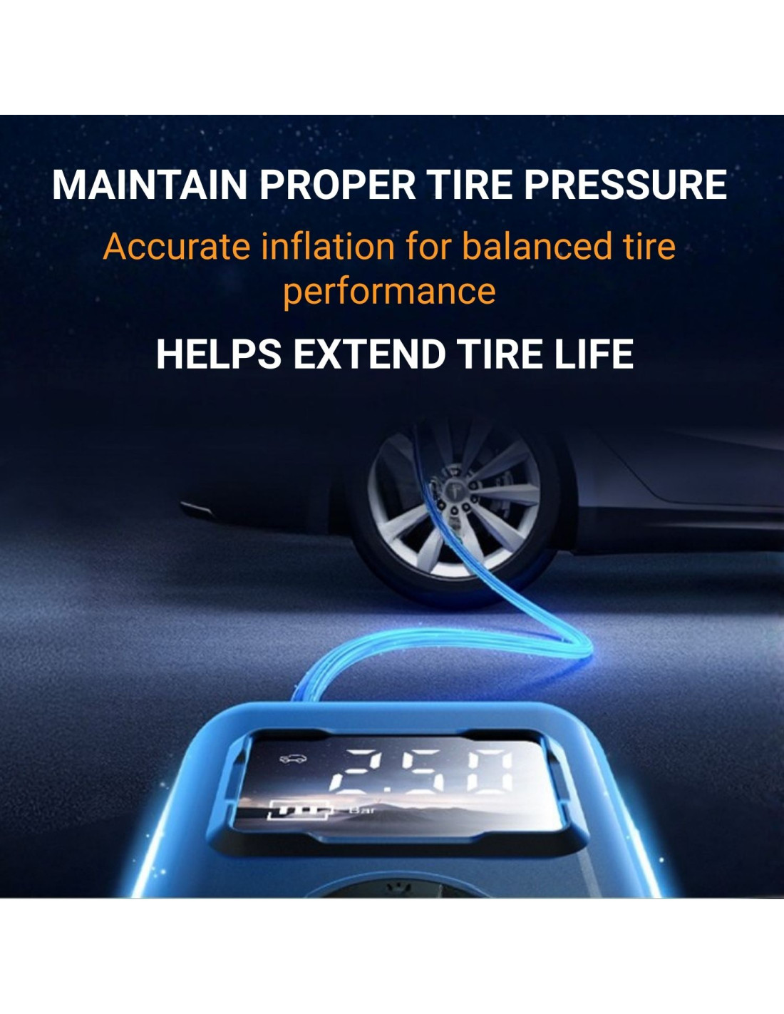 Šis belaidė padangų pripūtimo pompa turi integruotą įkraunamą ličio bateriją ir iš anksto nustatytus pripūtimo režimus dažniausiai naudojamiems objektams. Dėl kompaktiško dydžio jį patogu laikyti automobilyje, kuprinėje ar garaže, kad visada būtų po ranka