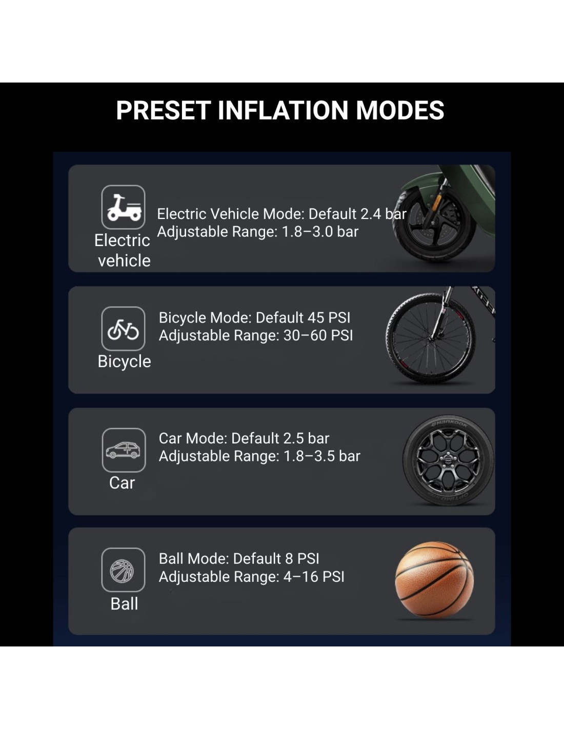 Iš anksto nustatyti režimai: Tinka automobilių, motociklų, dviračių padangoms ir kamuoliams.