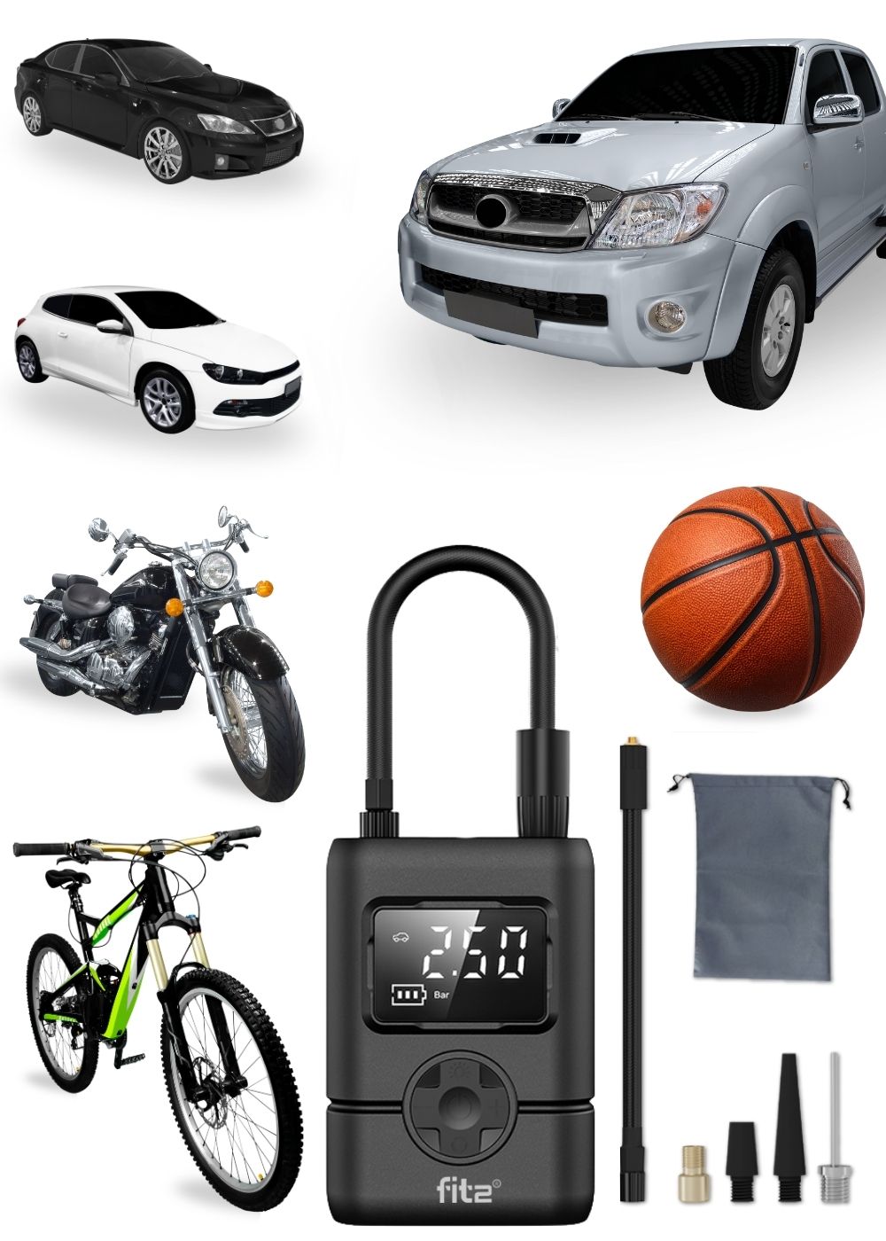 FIT2 Mini belaidė oro pompa RLA-2401 yra kompaktiškas ir patogus naudoti oro kompresorius, skirtas kasdienei padangų priežiūrai. Ji leidžia tiksliai pripūsti automobilių, motociklų, dviračių padangas bei sportinius kamuolius be išorinio maitinimo šaltinio. Skaitmeninis ekranas ir automatinio išjungimo funkcija užtikrina kontroliuojamą ir saugų naudojimą.