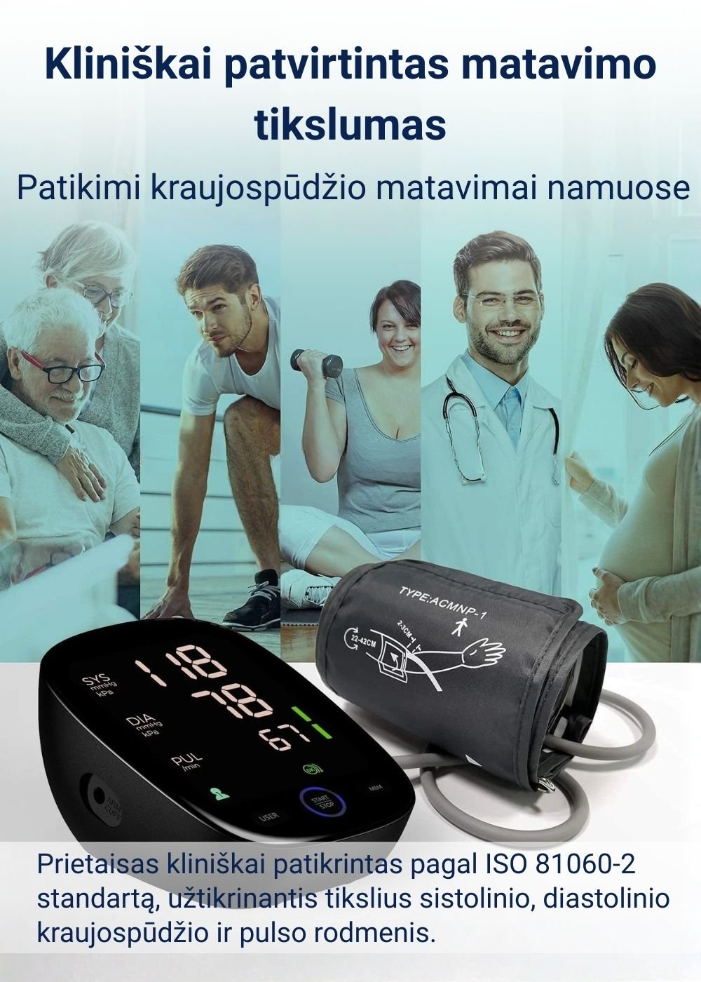 • Kliniškai patvirtintas tikslumas: Klinikiniai tyrimai atlikti pagal ISO 81060-2:2018+A1:2020 standartą, taikomą automatiniams kraujospūdžio matuokliams, užtikrinant patikimus sistolinio, diastolinio kraujospūdžio ir pulso rodmenis.