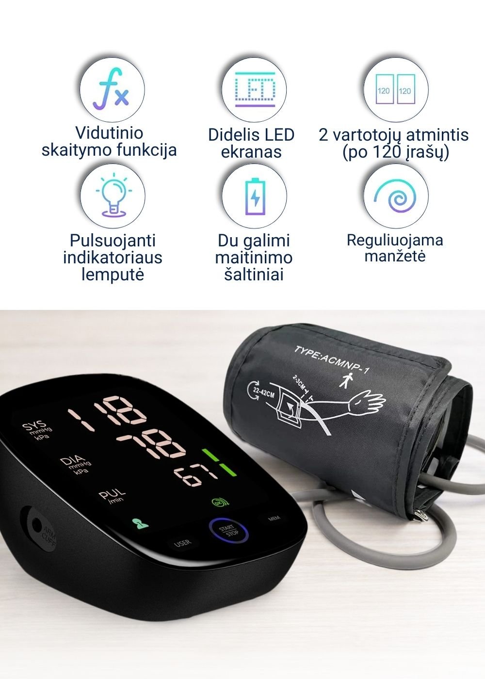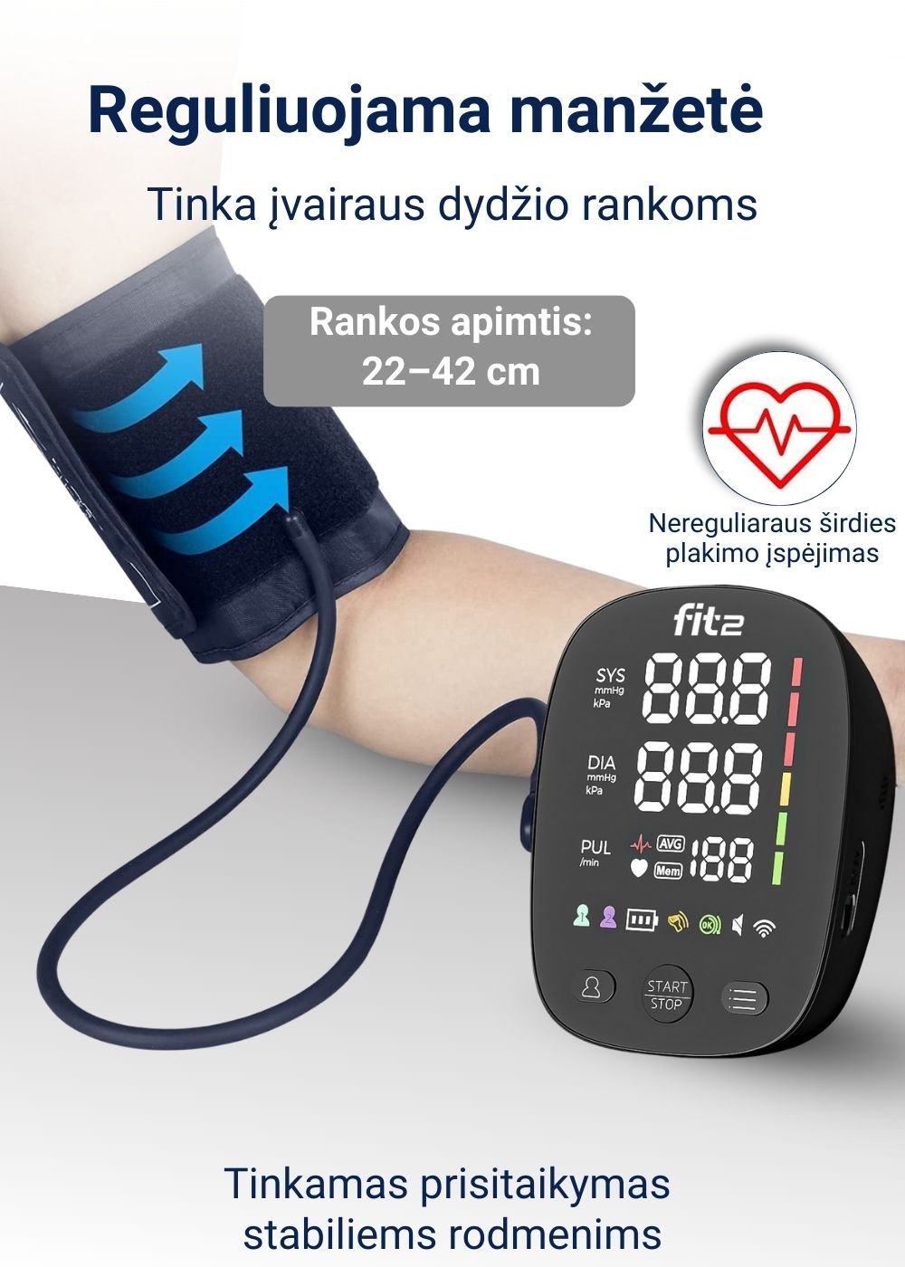• Reguliuojama žastinė manžetė: Tinka 22–42 cm žasto apimčiai.