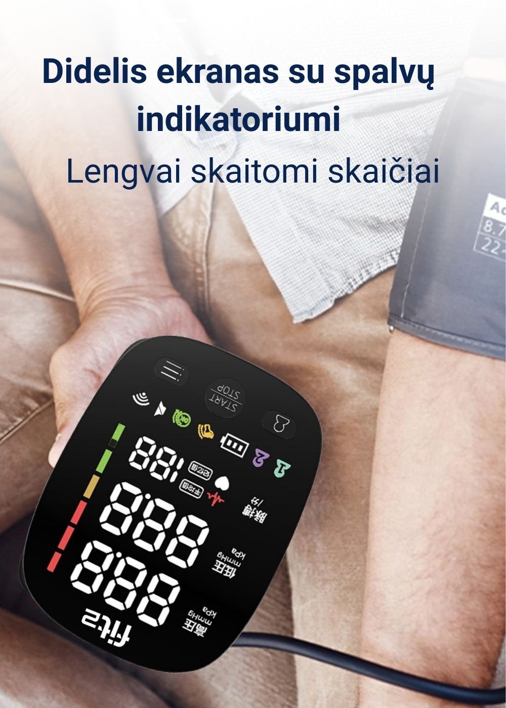 • Spalvinis kraujospūdžio indikatorius: Vizualinė skalė padeda greitai įvertinti rezultatus.