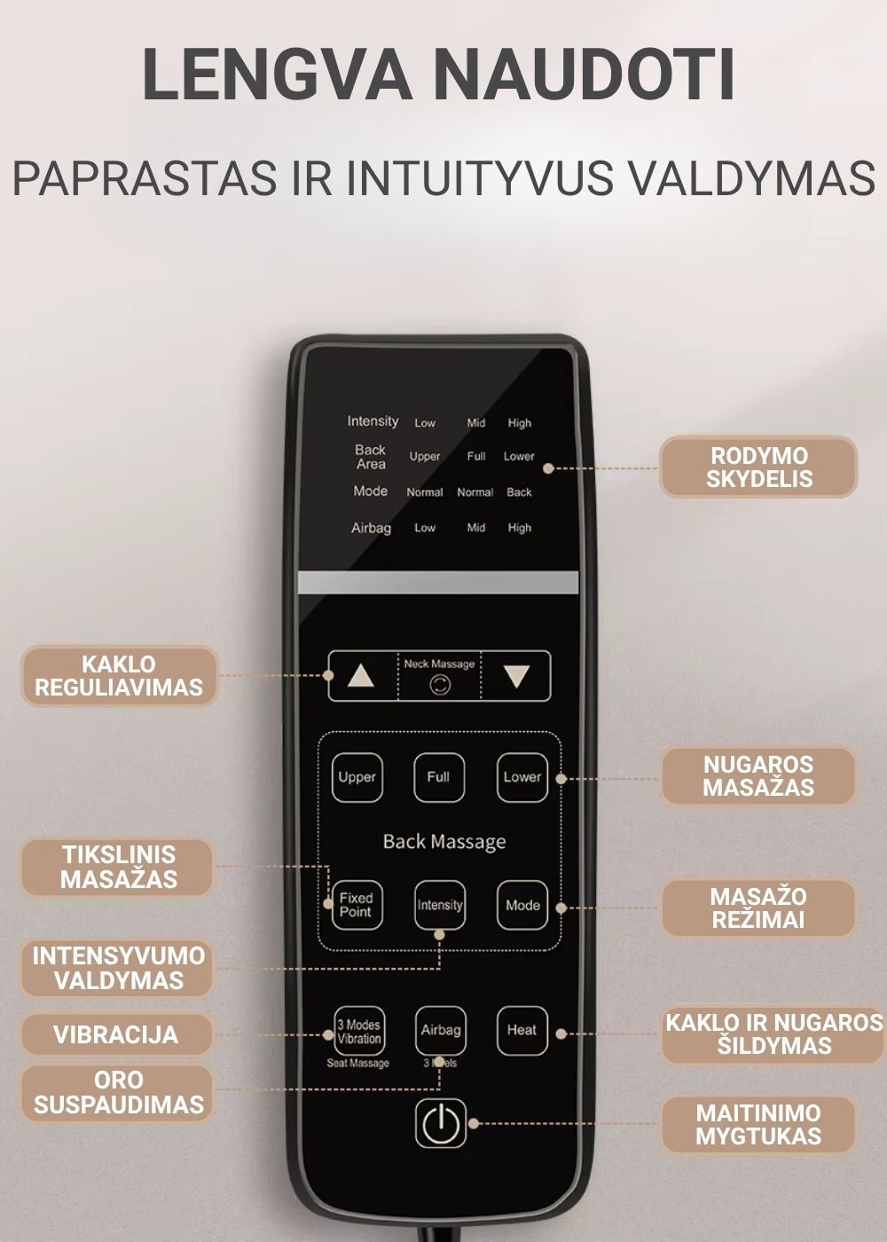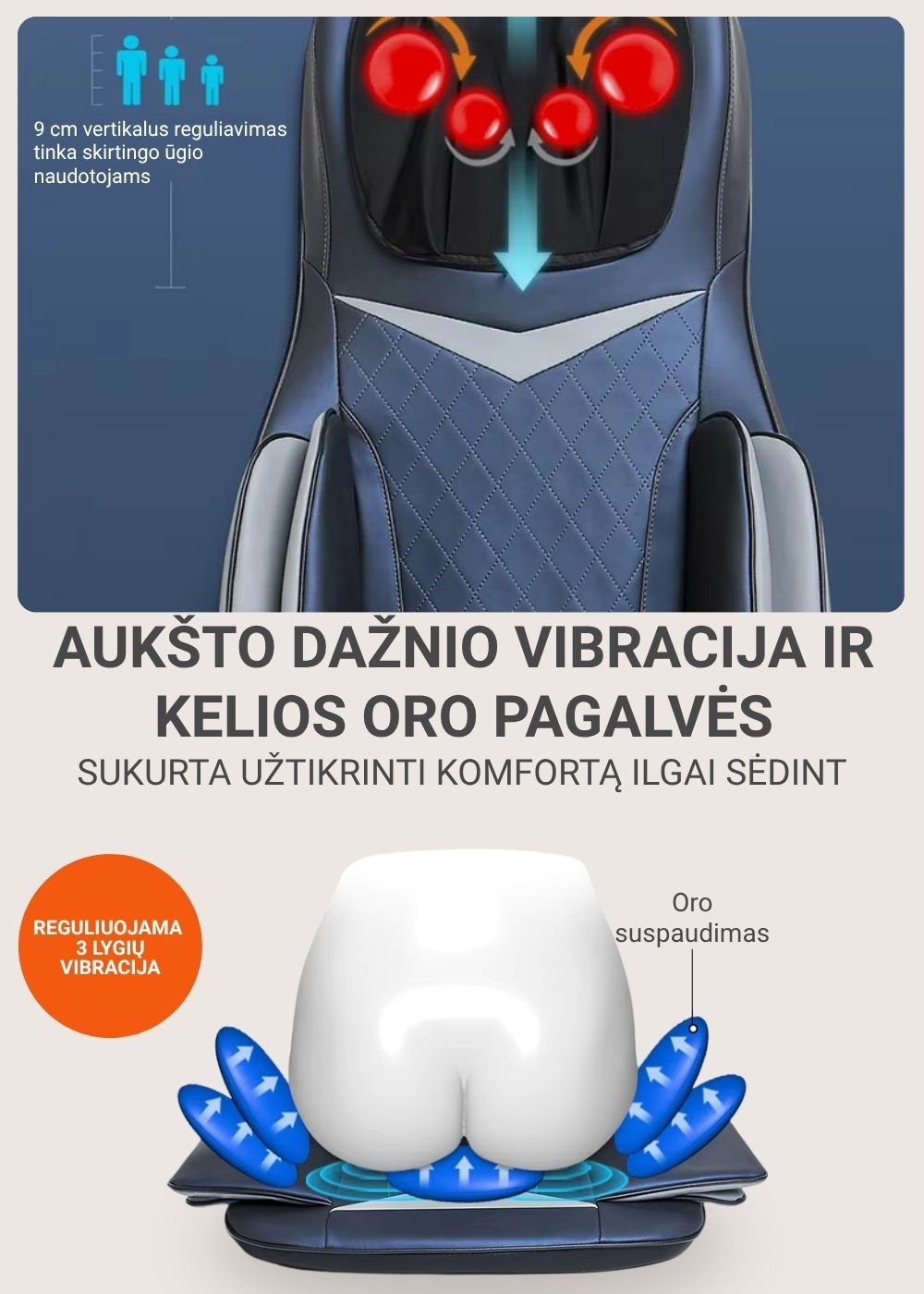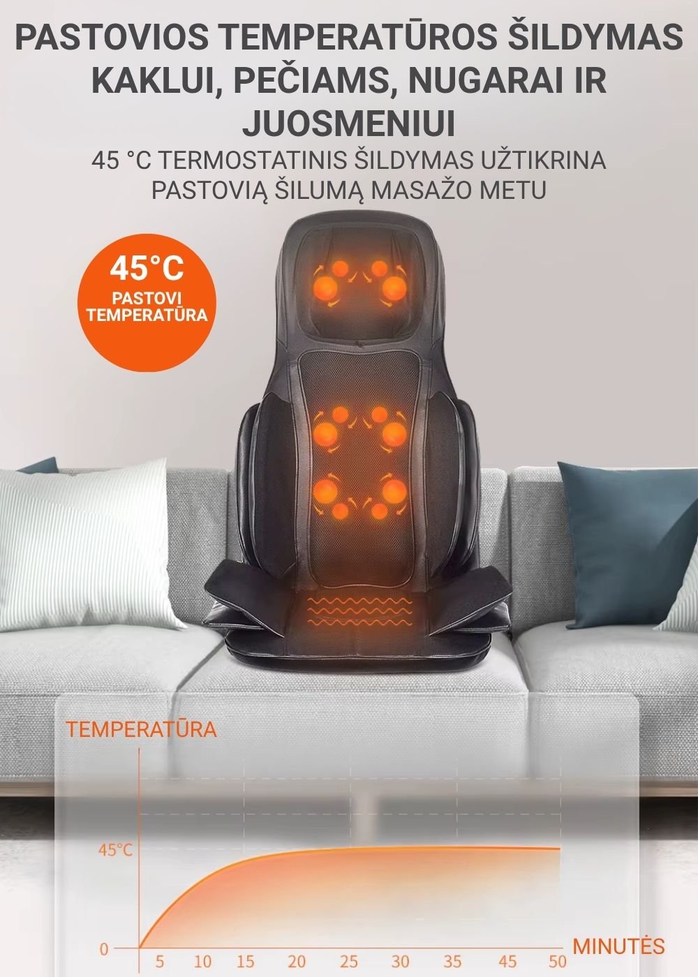 Šildymo funkcija: švelni šiluma padeda atpalaiduoti raumenis ir sustiprina masažo poveikį.