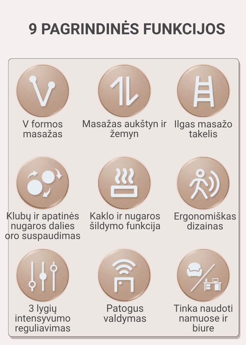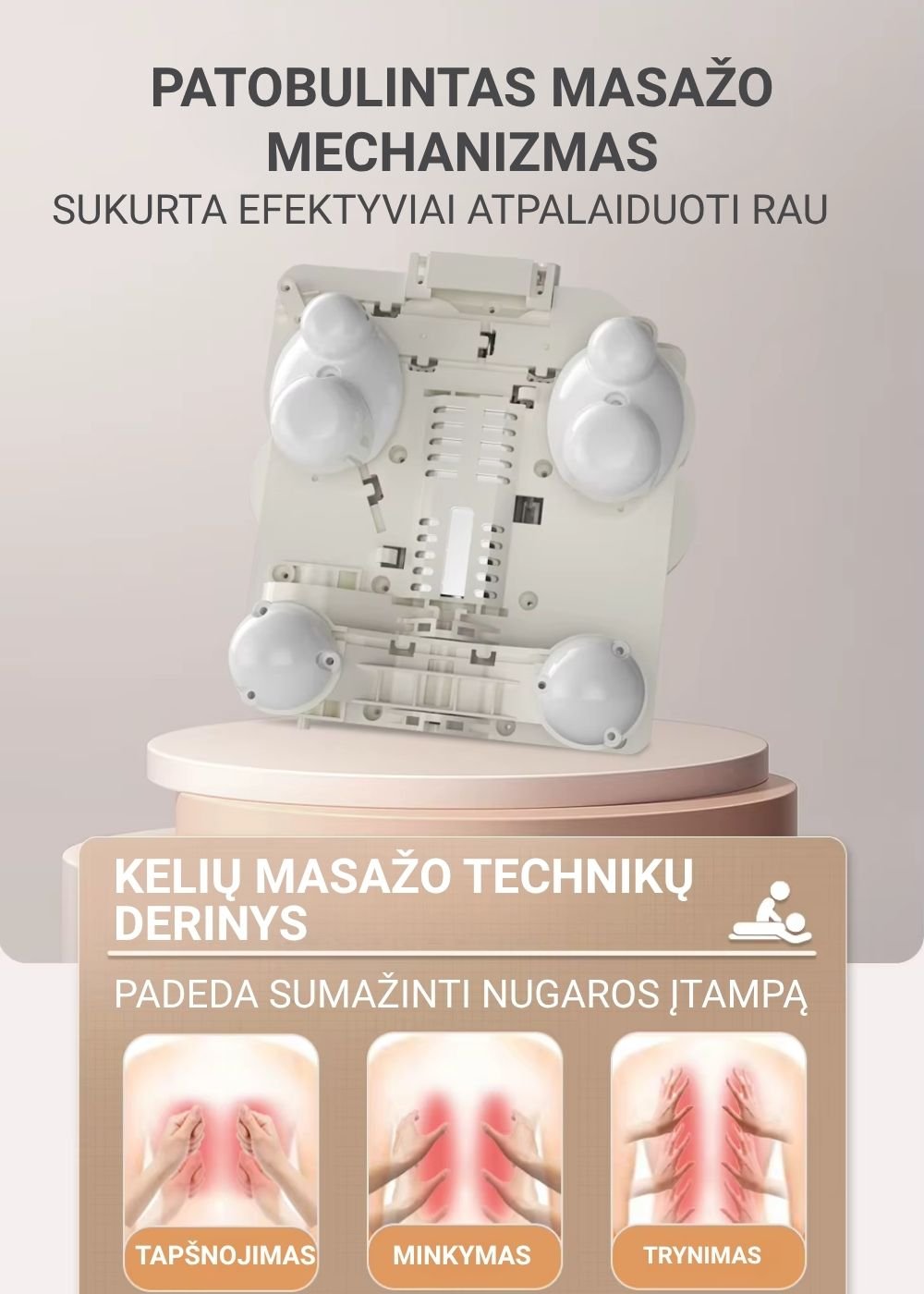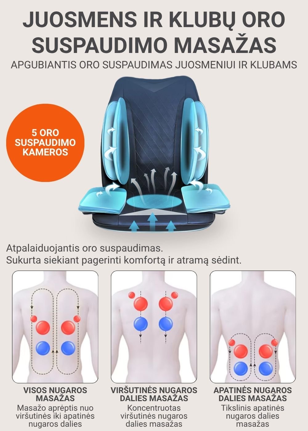 Šildymo funkcija: švelni šiluma padeda atpalaiduoti raumenis ir sustiprina masažo poveikį.