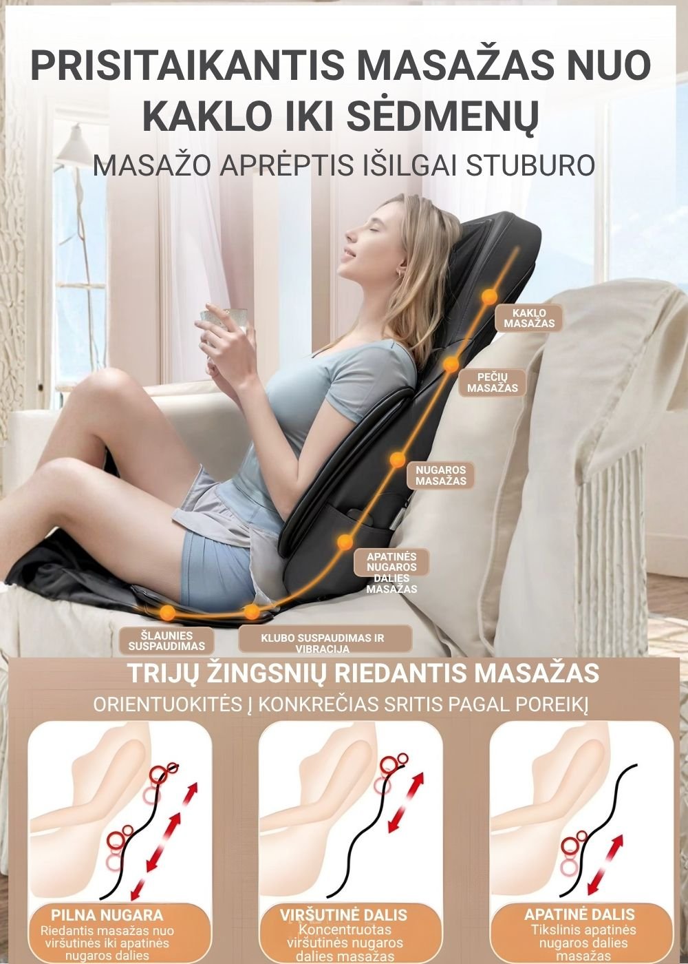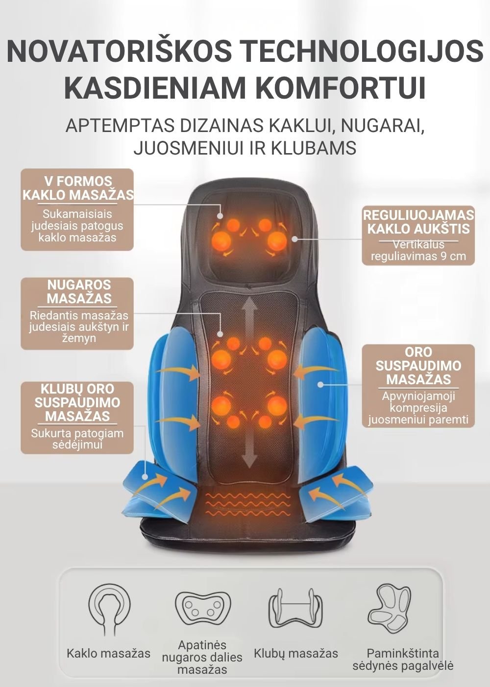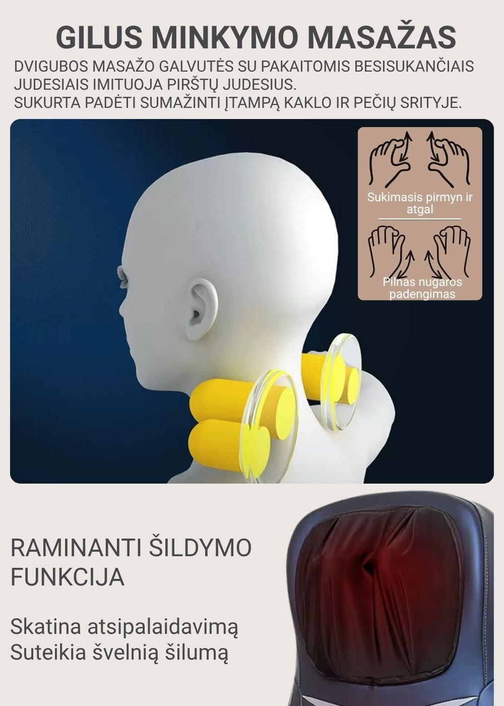 Vertikaliai judančios masažo galvutės: masažuoja kaklą, pečius ir visą nugarą.