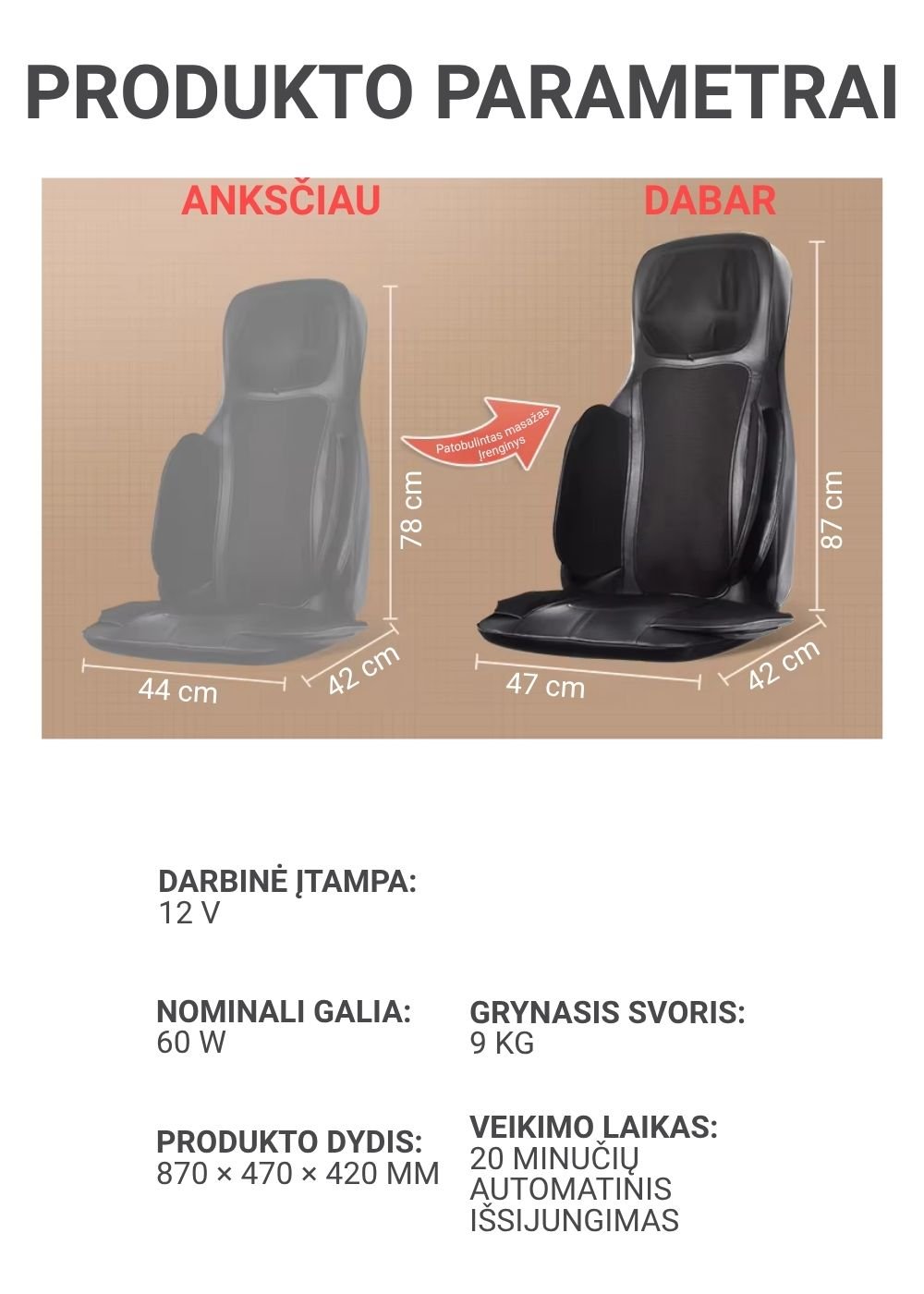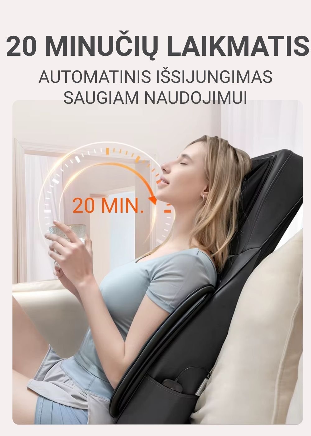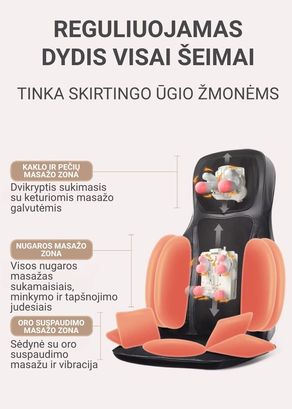 Vertikaliai judančios masažo galvutės: masažuoja kaklą, pečius ir visą nugarą.
