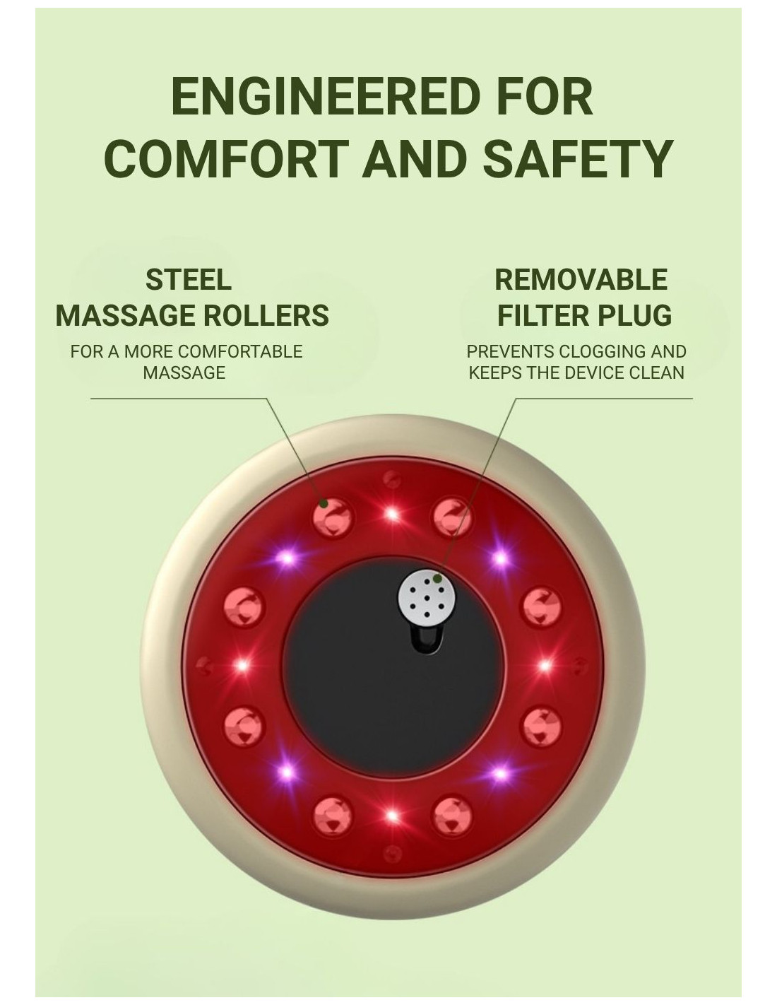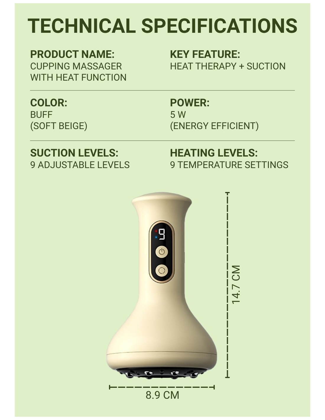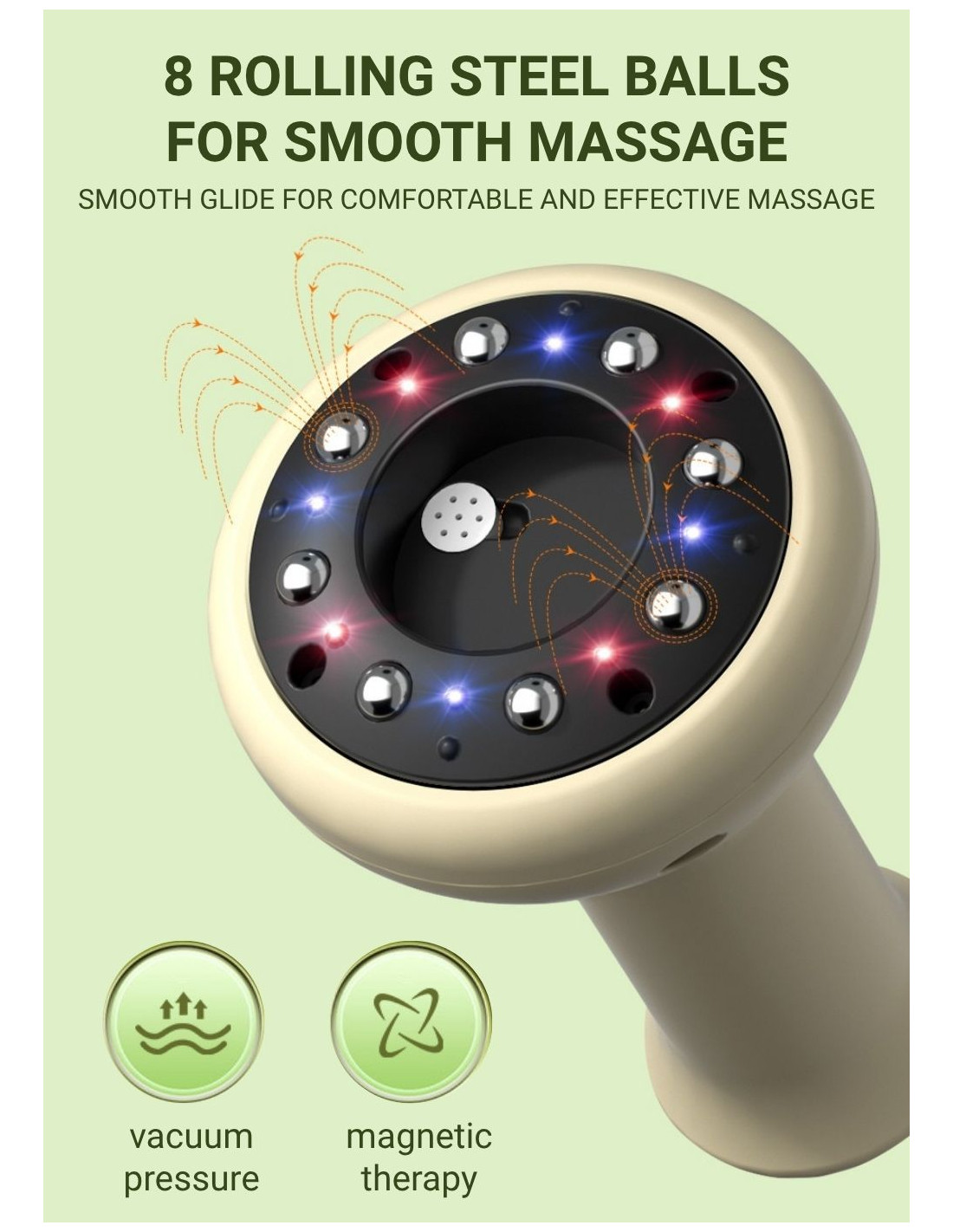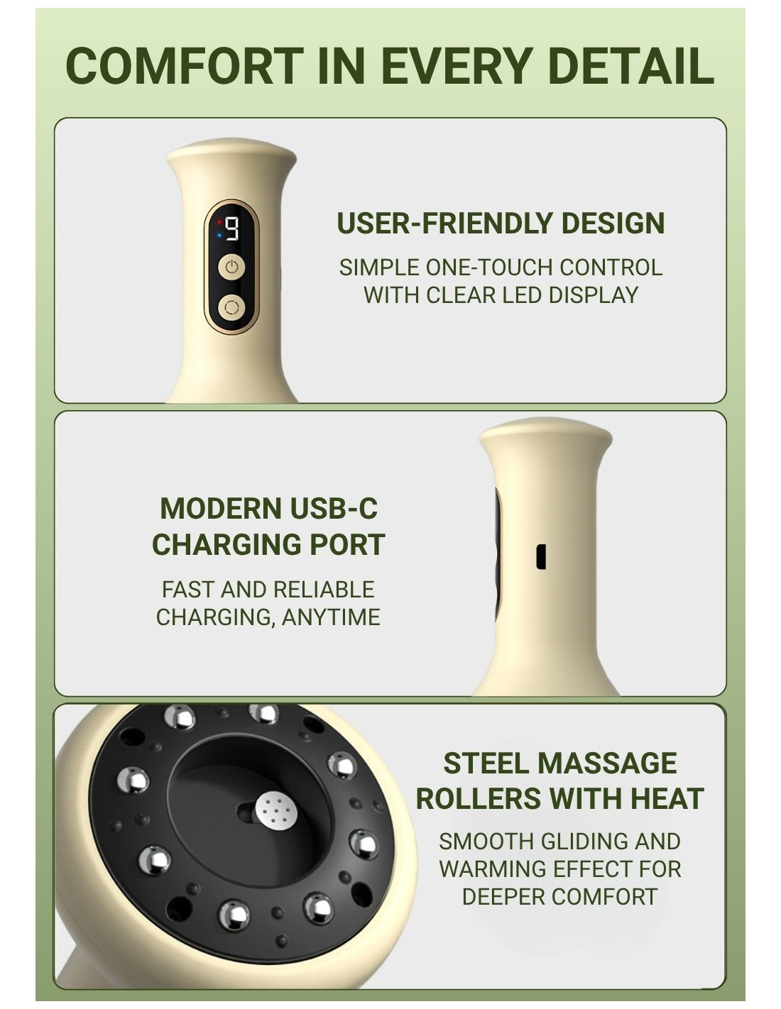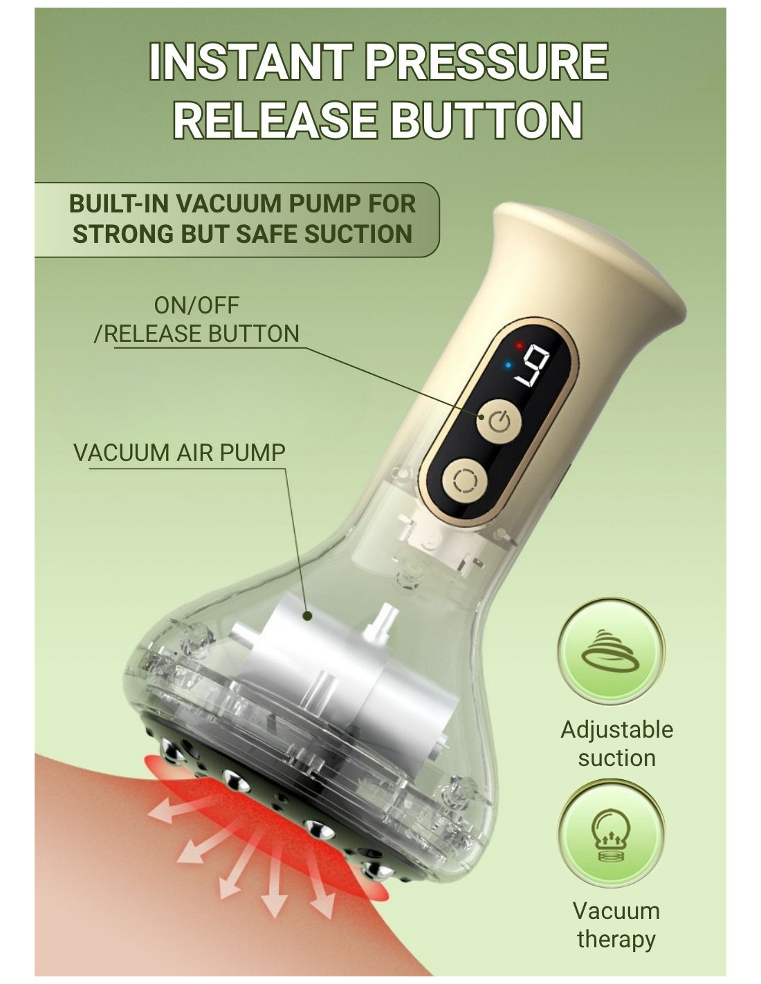 Nuo tradicinio vakuuminio gydymo iki šiuolaikinės šiluminės terapijos – šis prietaisas palaiko įvairias technikas: vakuumavimą, gua sha, masažą ir šildymą. Galima naudoti įvairioms kūno vietoms – juosmeniui, pečiams, rankoms, kojoms ir nugarai – gerinant savijautą bei skatinant raumenų atsigavimą.