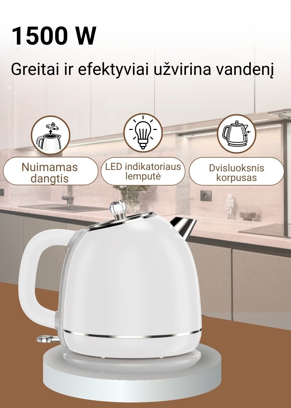 1500 W galia užtikrina greitą vandens užvirimą kasdieniam naudojimui.