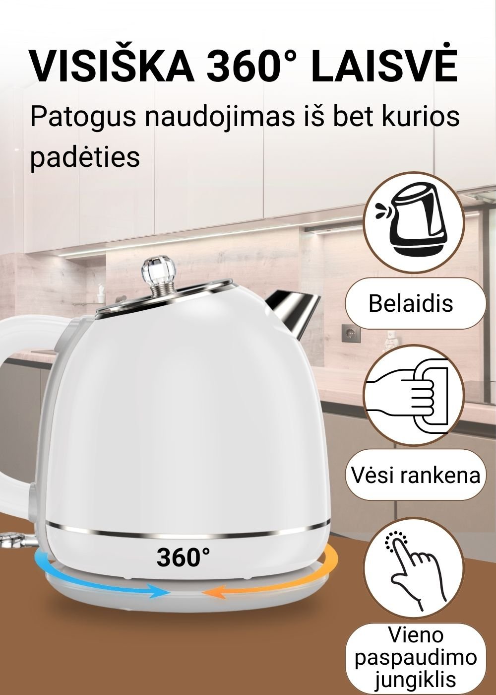 360° pasukamas pagrindas ir reguliuojamas maitinimo laidas leidžia patogiai naudoti virdulį bet kurioje virtuvėje.